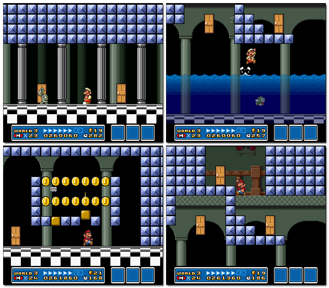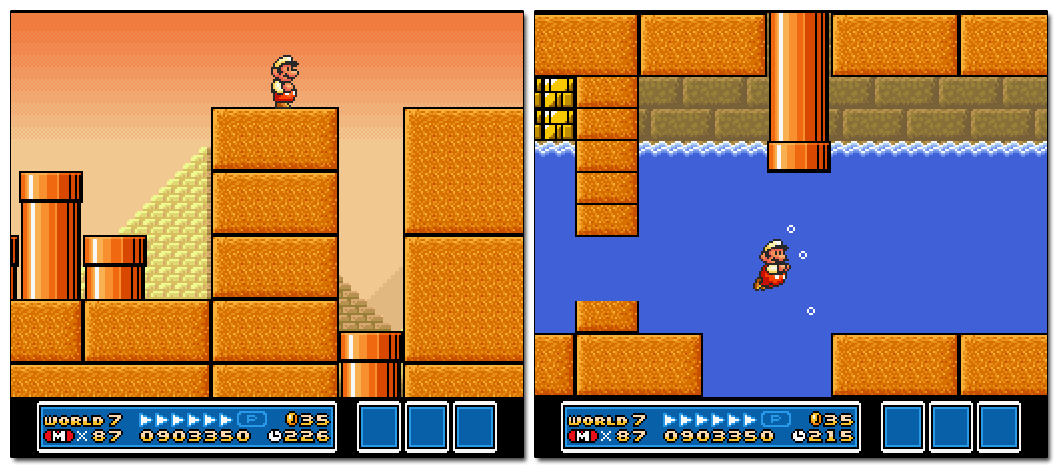 Beyond the clever architecture, one-time mechanics/dynamics, unique art assets, etc., the overall flow of the levels shows the importance of this goal. Even when the Worlds are themed — such as Ice Land — each of their consecutive stages use different tilesets and gameplay. The standard level is accompanied by multi-directional auto-scrollers, tense fortresses, sluggish underwater stages, battle arenas, one-off themed levels, labyrinth maps, bonus shops, airships, minigames, etc. Simply put, SMB 3 pulls out all the stops in trying to create a constantly stimulating experience that never feels repetitive.