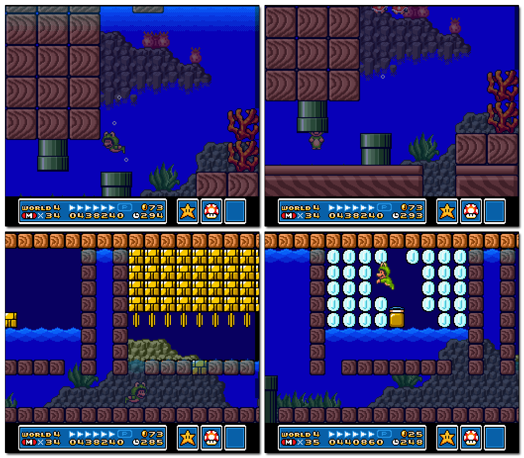 Cheep-Cheeps are usually encountered in large bodies of water, but in this level they can also be found in small, one-tile-wide cavities. It’s a unique occurrence, but executed very well.