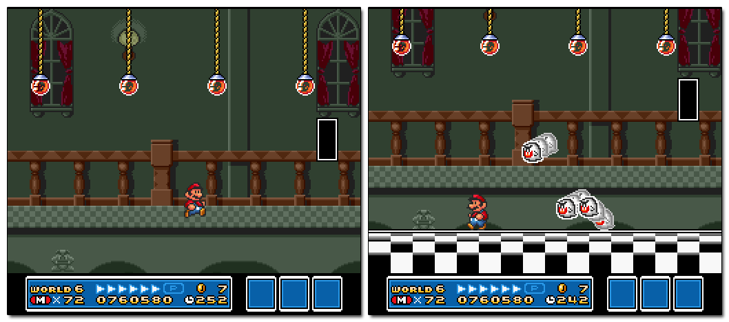 Instead, when the P-Switch is hit, an invisible door will appear close to it (so even if the player misses it, he’ll know about it’s presence). The hidden door leads to a secret room and a Tanooki Suit, and eventually back to the empty hallway. The lack of enemies in the level makes it easy to do all this backtracking without losing the suit, and its flight ability needs to be used in this section in order to reach the hidden exit pipe on the ceiling.