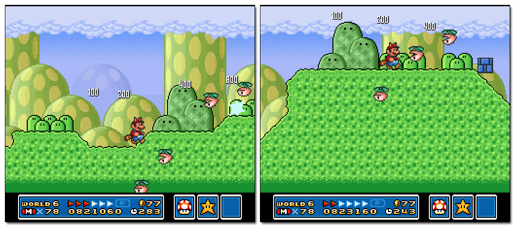 The effect makes the door feel like a gateway to the “normal” part of the game, in turn accentuating the surreal, alternate-universe nature of Giant Land. All this is also achieved with no extra art resources, and it comes across as quite unique since it’s never repeated in any other levels.