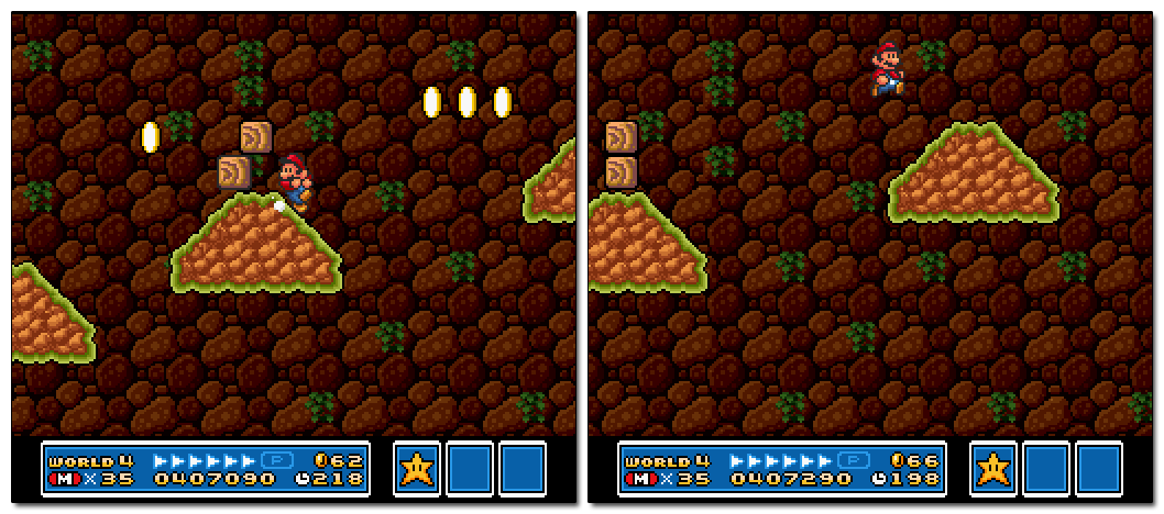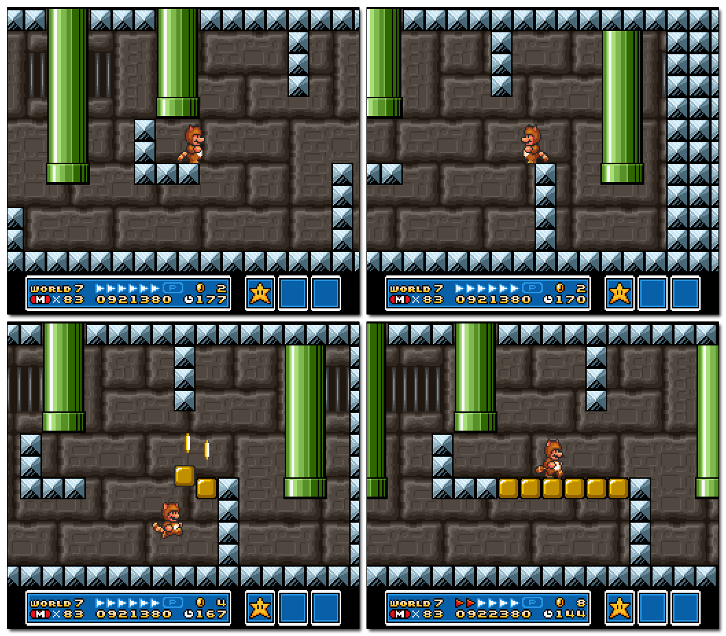 Once the P-Switch is hit, the cramped quarters make backtracking to the coins somewhat difficult (especially since the game always slides Mario to the right if he gets stuck under a block). However, the newly encountered ice provides less friction, which in turn makes sliding much easier. This relatively small difference is elegantly used to create a layout that would be frustrating (if not impossible) in other worlds.