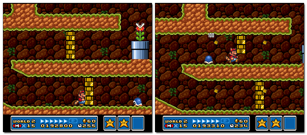 These tight tunnels are filled with one-off brick walls. Although it’s possible to destroy them with Raccoon Mario’s spin-attack, the plethora of Buzzy Beetles ensures that the player has many chances to use the enemies in order to carve a path through the level.