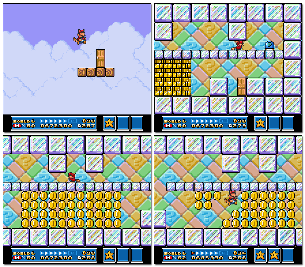 - Mario must first turn into Raccoon Mario if he’s not already capable of flight. This is made fairly easy by a small room that can be entered from a pipe at the beginning or end of the map. This room contains a powerup-dispensing “?” Block that respawns every time it’s visited.