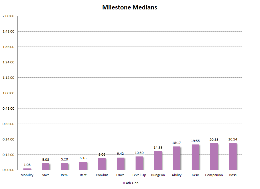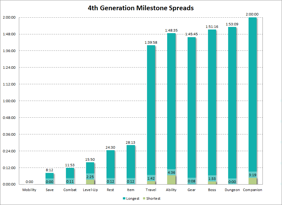Pokémon started off very quickly, coming in at or below the median for mobility, resting & saving, obtaining an item, combat, traveling, leveling up, gaining a new ability, and having a companion join the party. However, Pokémon didn’t map onto all these milestones as directly as other JPRGs.