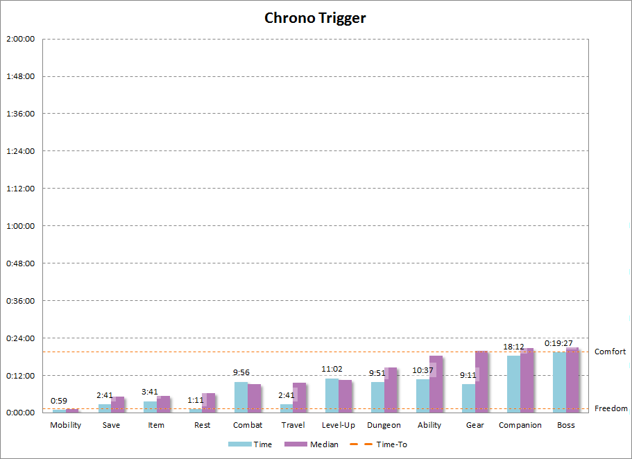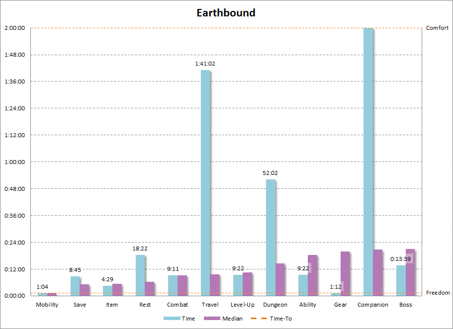 Earthbound was the first and only title on the list not to hit all the gameplay milestones within the 2 hour limit. It started off quite briskly, coming in at or below the median for TTF, item and equipment acquisition, combat, leveling up, and gaining a new ability. However, overall progression had a slower pace than its contemporaries.