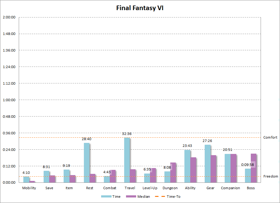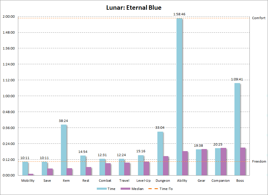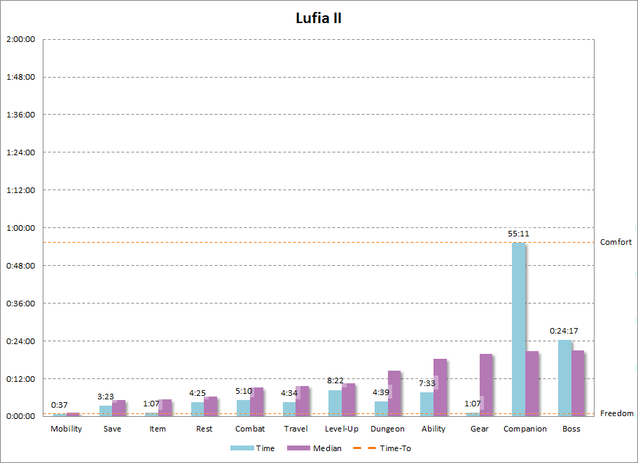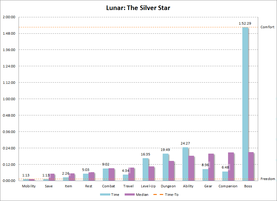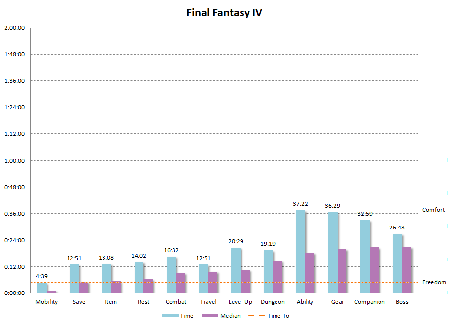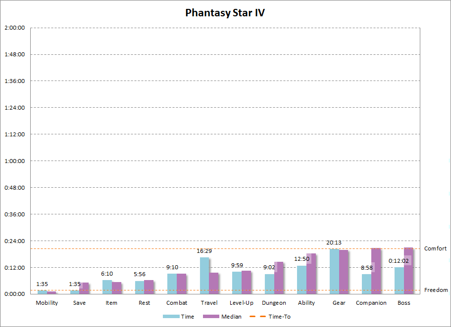 Subtracting TTF, no game took longer than 10 minutes to provide basic movement and game saving, no longer than 20 minutes to hit the first battle and level-up, and no longer than 30 minutes for a chance to rest and get some items. These six milestones seemed to form a core of 4th Generation JRPGs regardless of their personal takes on the genre.