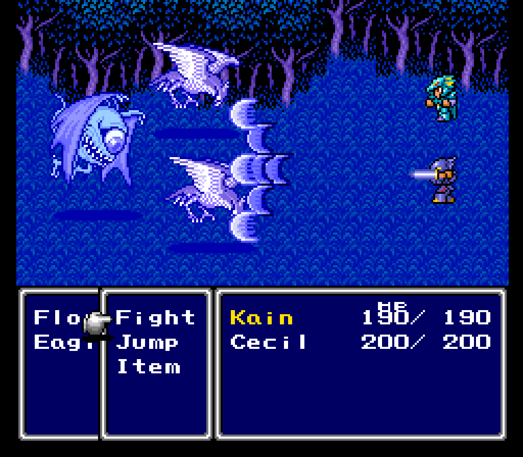 Once the restraints are fully off, FF IV hits an excellent pace in terms of both gameplay and narrative. Random battles are fairly frequent, but running away is always an option — with the additional risk of losing money — and level-grinding is not required. Party members come and go very quickly, and the plot continuously unfolds at each turn.