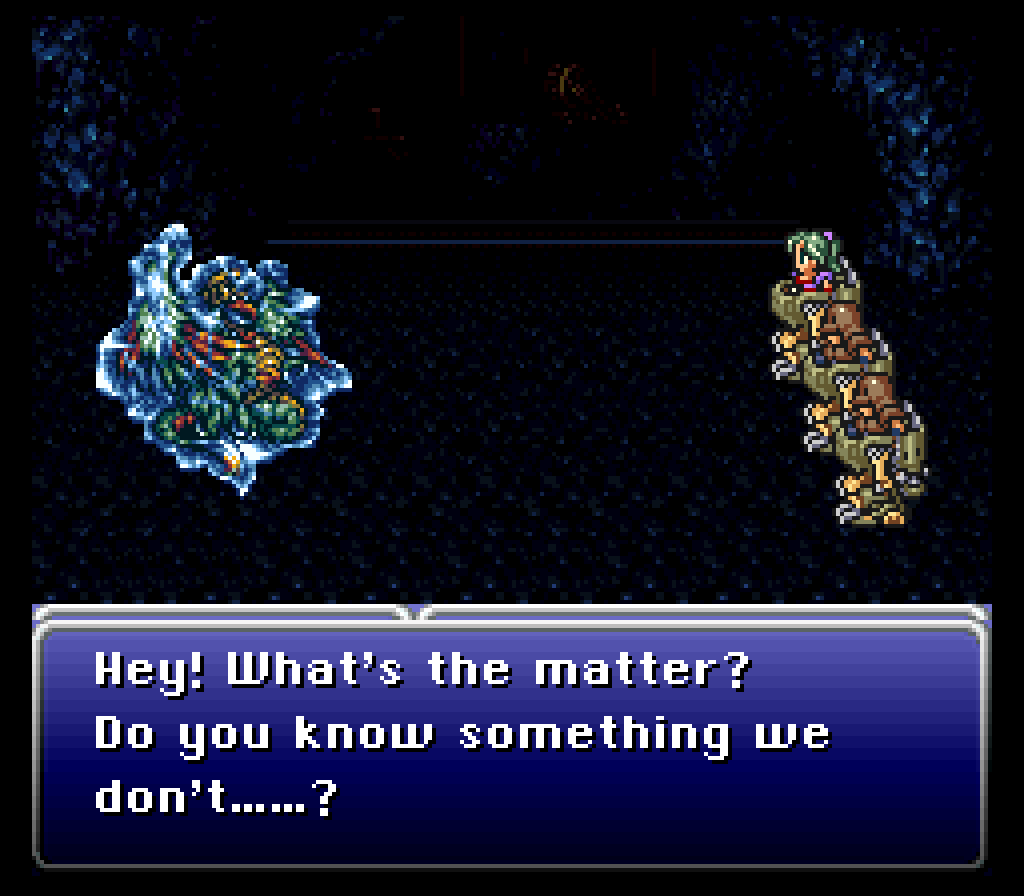 Once the boss was defeated, the game switched to a different playable character, a motif unique to FF VI as the game deemphasized the singular protagonist. The overall experience was also a lot more scripted than other JRPGs as there wasn’t as hard a line between cutscene and freedom; some of the enemies were present on the map and quickly yelled out before attacking, the camera briefly panned to show forces pursuing the player, party members were given short barks in combat to hint at a tactic against the boss, etc.