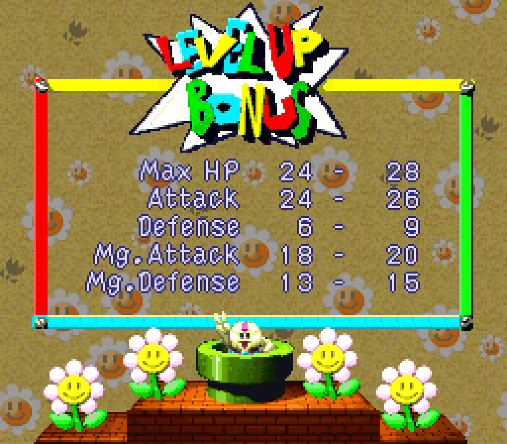 Perhaps wanting to avoid overwhelming newcomers to the genre, all numerics in Super Mario RPG were on the smaller side. This included max character levels, which were restricted to 30 rather than the more typical 99. This meant that leveling up, and by extension gaining new abilities, was a bit more spread out. Despite this, Super Mario RPG still hit all its milestones in well under 45 minutes.